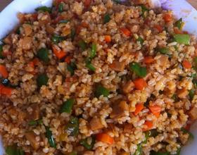 - 6. 倒入适量油,花椒过油后捞出,依次倒入葱花,火腿肠丁,红萝卜,青椒,可根据个人口味调入些番茄酱。放入盐,鸡精,也可放入些味极鲜,也是根据个人喜好。翻炒出诱人香味后放入米饭。