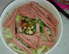 装碗:先摆一层黄瓜,稍微撒一点盐,再洒青椒,然后两勺万能酱料,加醋,生抽等个人喜好的调味料。然后铺火腿肠,搞定,可以吃啦。