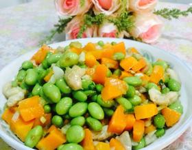 锅中倒入水,水烧开后将青豆和胡萝卜焯八成熟
