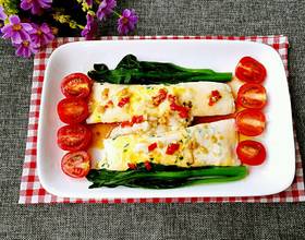 最后摆盘的时候,加入开水烫好的菜心,以及一些圣女果做装饰,再淋入做好的酱料,一份色香味俱全的肠粉就做好啦。