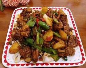 - 11. 土豆焖熟之后放进,大葱段、青椒翻炒,加入鸡精