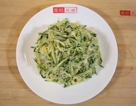 黄瓜洗净斜刀切成片,然后顶刀切成细丝。