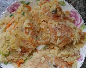 再放面粉鸡蛋切好土豆红萝卜丝放油调料黑胡椒