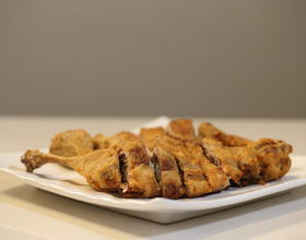 - 6. 待锅烧热后下油300克左右,转大火烧至五六成热时,把鸭腿放入糊中沾匀淀粉下入锅中,炸至金黄色时捞出控油
