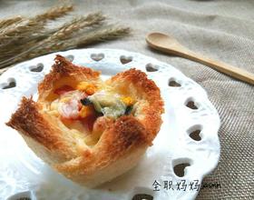 - 5. 吐司片去边后用擀面杖稍微擀一下(不要求外观也可以不去边,我这里就有三片没去边!),在四条边中间处用剪刀剪开一小段,围成碗状放进马芬模内!