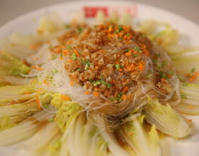 - 8. 接下来在娃娃菜的上面铺上已经泡好的粉丝,将拌好的蒜末放在粉丝上面