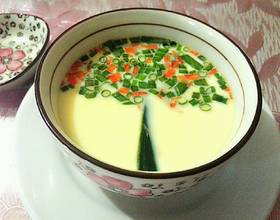 把水蛋碗放入蒸锅里,将切好的葱和胡萝卜轻轻放入碗里靠一边