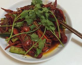 放入小龙虾爆炒至红色,倒入调料炒匀后加入清水,闷至20--30分钟,加入黄瓜收汁