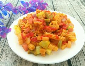 - 4. 然后把煮好的意面倒入锅里,关小火,再将意大利面酱,番茄酱,还有适量的盐和少许清水加进去进行翻炒