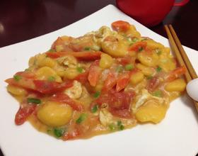 在锅里放油煎个鸡蛋同时放入胡萝卜番茄翻炒几下放入清水即可,等水煮开后把切好后的玉米年糕放入烧开的锅里