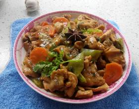 - 9. 加入鸡肉,翻炒均匀加入适量盐,花椒面,酱油,料酒,红糖,苹果醋,加适量清水炖二十分钟。
