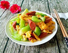 丝瓜削皮后,切棱形,火腿肠切棱形,鸡蛋打散。