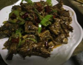 爆炒1分钟放入盐,味精,鸡精和东古继续爆炒3分钟放入尖椒段