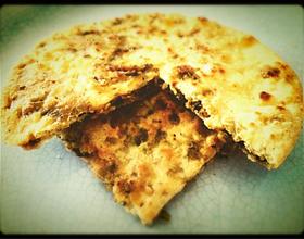 撒上干面粉,把饼用擀面杖擀平,尽量的薄,并在表面刷油