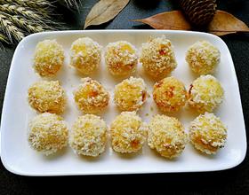 先把土豆球丢面粉里面滚一下,周围都要均匀的沾上面粉,再到蛋液里面滚一下,最后才放面包糠里面,周围粘上均匀的面包糠。