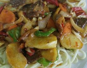 - 5. 土豆炸好之后直接捞出来准备好所有的材料土豆,切好的菜,还有牛肉