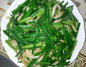 放入手擀粉翻炒,然后放入韭菜苔继续翻炒,
