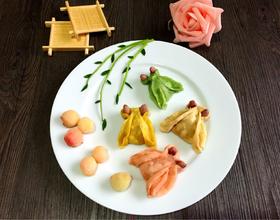 将头部面皮中间部分向里收捏紧,留出两个眼睛,放入两颗花生米,将折起来的翅膀向上翻出,尾端捏紧,作出花纹