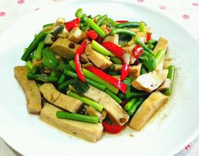 再把蒜苔,盐,白糖,黑胡椒粉,放入翻炒,适量加入一点水翻炒,防止粘锅。