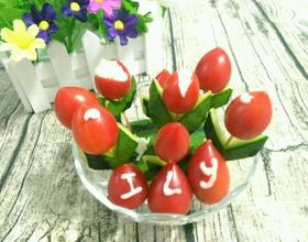 也可以在圣女果顶上割一个小口,挤上点沙拉酱,又成了不一样的花朵
