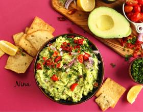 牛油果中加入少许柠檬汁,用叉子压成泥,然后加入所有的食材。