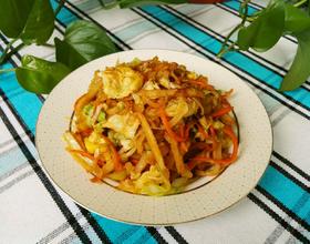 把切好的卷心菜,胡萝卜一起倒入锅中翻炒