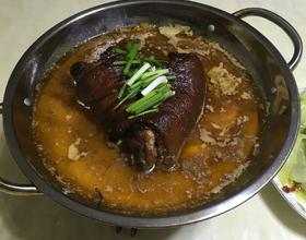 煮好了换一口小锅,另外加油加水,因为它的汤会浓稠会咸。把蹄膀放过来,放入蒜,煮开即可。