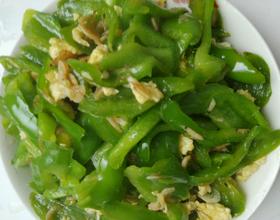 待青椒颜色变深,倒入蛋花,一起翻炒