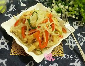 - 12. 炒至豆芽变软,加鸡丝一起翻炒;