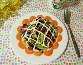 再拿个沙拉碗。我用的是个平盘,将拌好的蔬菜沙拉摆放盘中,边上点缀一圈胡萝卜片 ,挤网格状大概两勺的沙拉酱在蔬菜上。这么简单的蔬菜沙拉就做好了,开吃吧。喜欢吗?