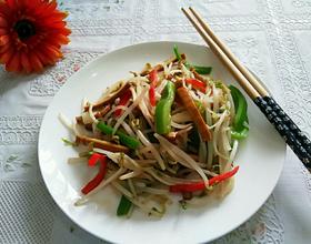 炒锅烧热倒油,放蒜片爆锅,倒绿豆芽翻炒片刻,倒豆干,青红椒翻炒,出锅前放少许盐,出锅