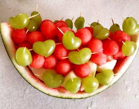 把一半西瓜再切一半,苹果打皮切块,也可以用勺子挖,放在最下面那层,西瓜挖成圆儿,把提子切开拼在一起像一个爱心的形状,用牙签固定住。