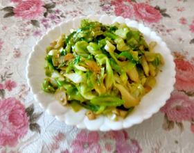 炒到断生放辣椒和蒜片,然后快熟了后,加盐调味