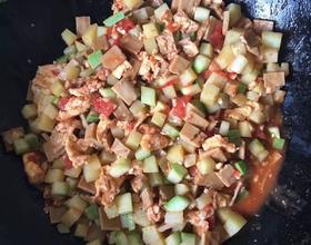 菜样可以换别的,比如青椒、香菇等,先放难熟的菜后放易熟的菜。土豆、西葫芦比西红柿以及鸡蛋要难熟,所以先放土豆及西葫芦。锅内如果没有油了,可以补点油。如果炒菜觉得干了可以加点水。放调料调味时最好放一点水,有助于调料溶解,并搅拌均匀。