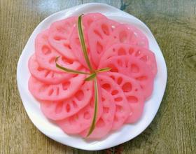 莲藕焯水再过凉,一是去掉藕的凉性,二是藕片更脆。食用色素可以用蔬菜汁代替,比如紫甘蓝汁,红苋菜汁,遇白醋就会变成想要的颜色了。