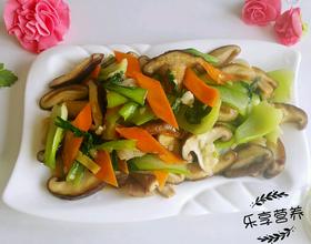 加入烫好的油菜,香菇,加入少许盐,糖,蚝油,生抽炒匀即可
