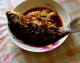 起锅,放入适量油,加入姜末,香辣豆豉,生抽和料酒,撒上葱花。最后淋到鱼上。可以享用美味了。