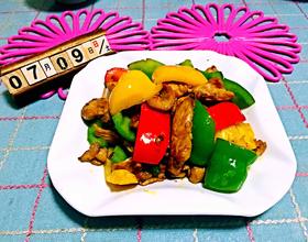 彩椒切块,鸡脯肉切片,加入盐,五香粉,淀粉,老抽,料酒,生姜腌制十分钟