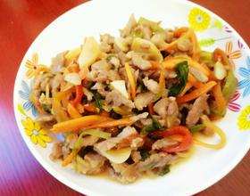 加入葱丝胡萝卜丝彩椒丝翻炒