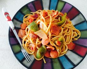 将煮好的意大利面控干水分,倒入菜锅中,加少量盐,胡椒粉翻炒均匀,这时就已经做好了,可以出锅了。
