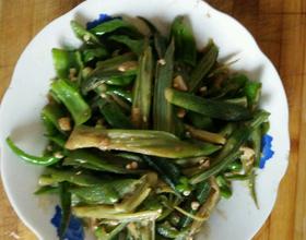 热锅放入食用油,加入蒜,炒出蒜香,加入秋葵,翻炒,加入青椒,翻炒加入食用盐即可。