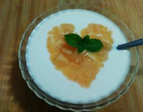留取小部分汁在表面淋成心形,在中间放入哈密瓜丁,再加薄荷叶点缀。