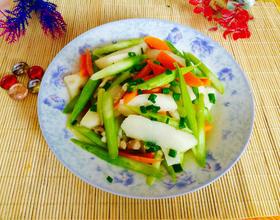 山药削皮后洗干净,切块后备用,需要泡在冷水里防止变色!芦笋的下端有些许老,用孢子把皮弄掉,照样可以吃的!翻炒要勤快哦!要不然很会粘锅的哦!喜欢吃辣的可以适当放几个小红辣椒,增加食欲