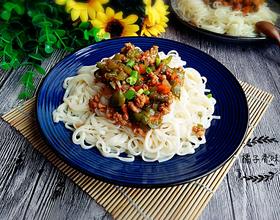 - 12. 把面条夹到盘子,上面放猪肉青椒卤,吃得时候拌匀即可