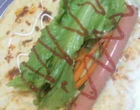 煎熟之后,把生菜胡萝卜火腿肠依次放在手抓饼饼上,然后再挤上番茄酱