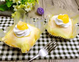 放在玻璃纸上放到蛋糕拖里面即可.顶部挤一个奶油花.上面放3、2个芒果颗粒