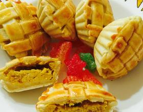 南瓜蒸熟打成泥加入杏仁粉奶粉橙子味果珍黑加仑葡萄干吉士粉拌匀待用