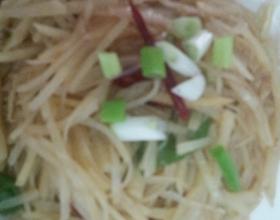 锅热添油,下葱姜土豆丝翻炒片刻,放盐,糖,胡椒,醋,辣椒丝快速翻炒均匀,尝土豆丝微软、咸淡味即可出锅……