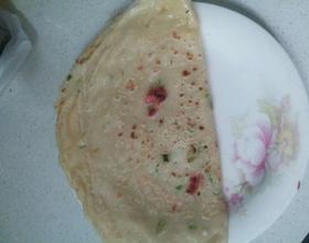 打鸡蛋,放盐,葱,西红柿红点,上锅烙薄饼