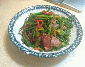 - 1. 韭花洗干净,切三四厘米长的段,卤猪舌切片,大蒜和姜切片,辣椒切菱形,备用!